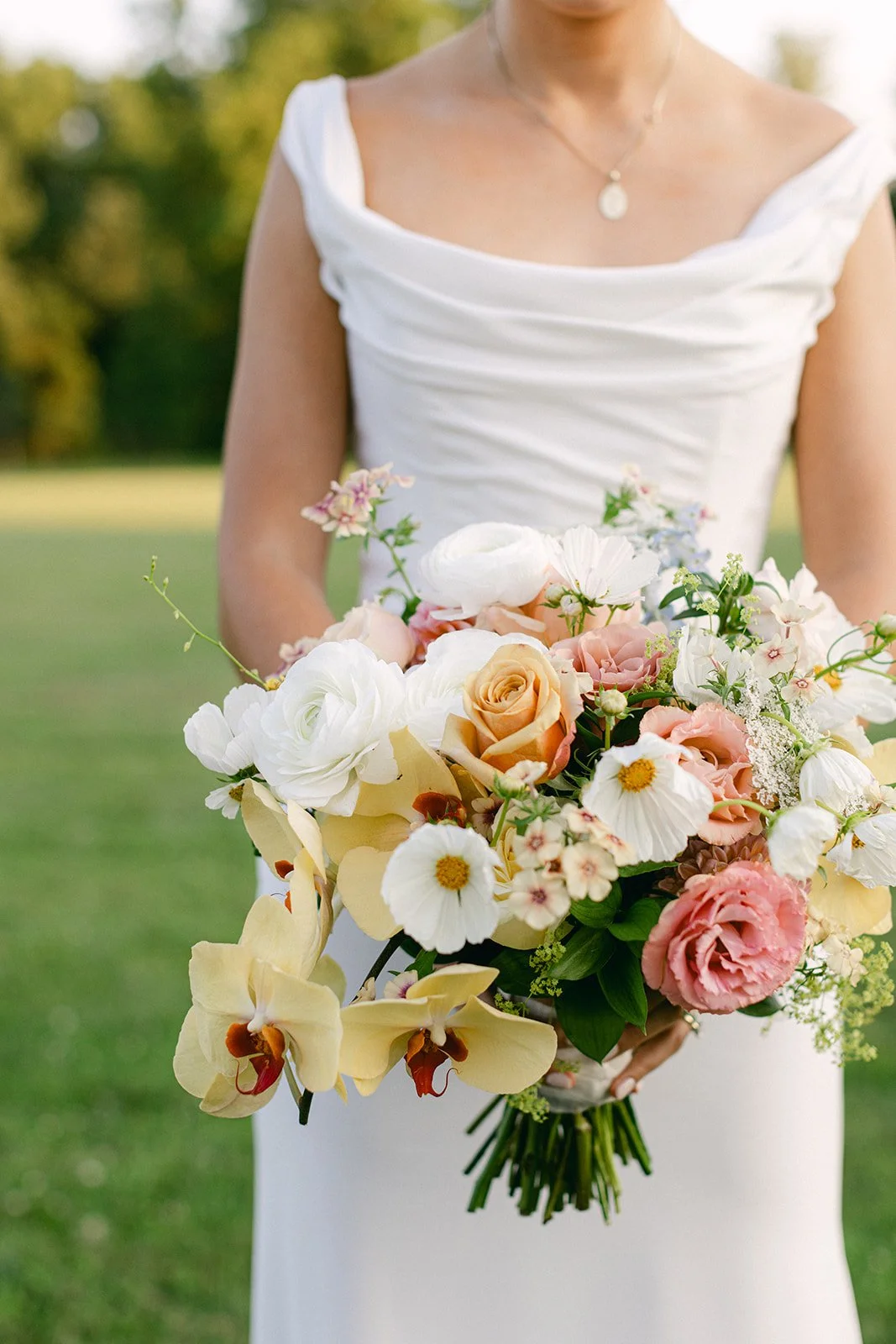 A woman in a white dress holding a colorful bouquet of flowers with orange, pink, and white blossoms, set against a green, blurred outdoor background.